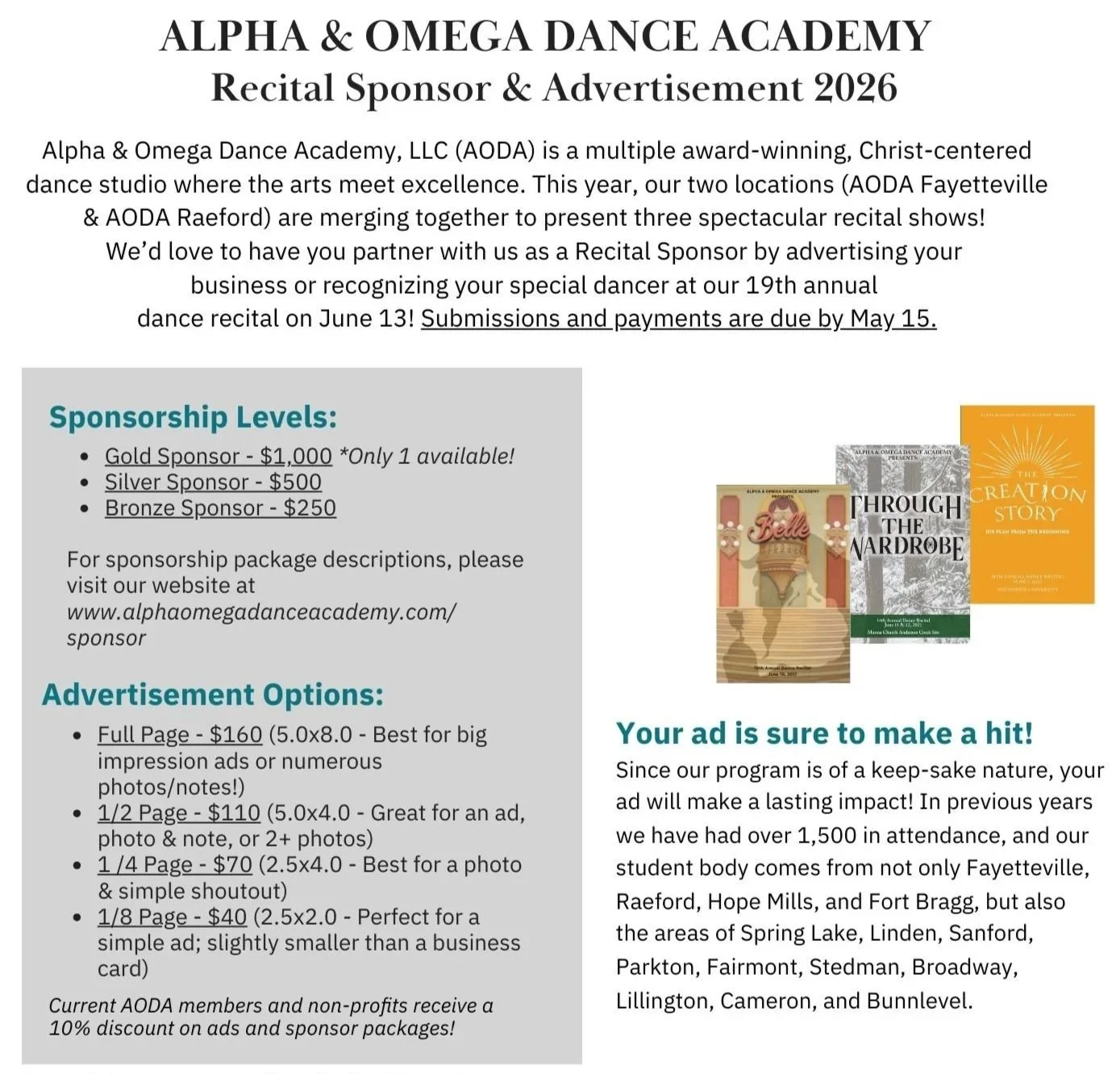 Thank you for your consideration in supporting our annual spring dance recital! By doing so, you are not only supporting our hundreds of dancers, but also supporting AODA as a small, local, Christian business — plus telling hundreds about your business!